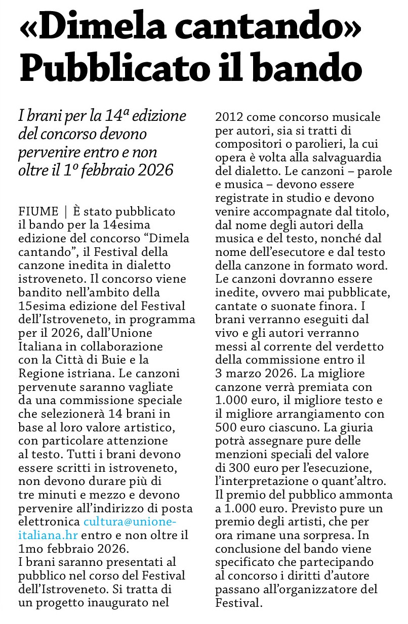 - La voce del popolo, “Dimela cantando” Pubblicato il bando (23. oktober)